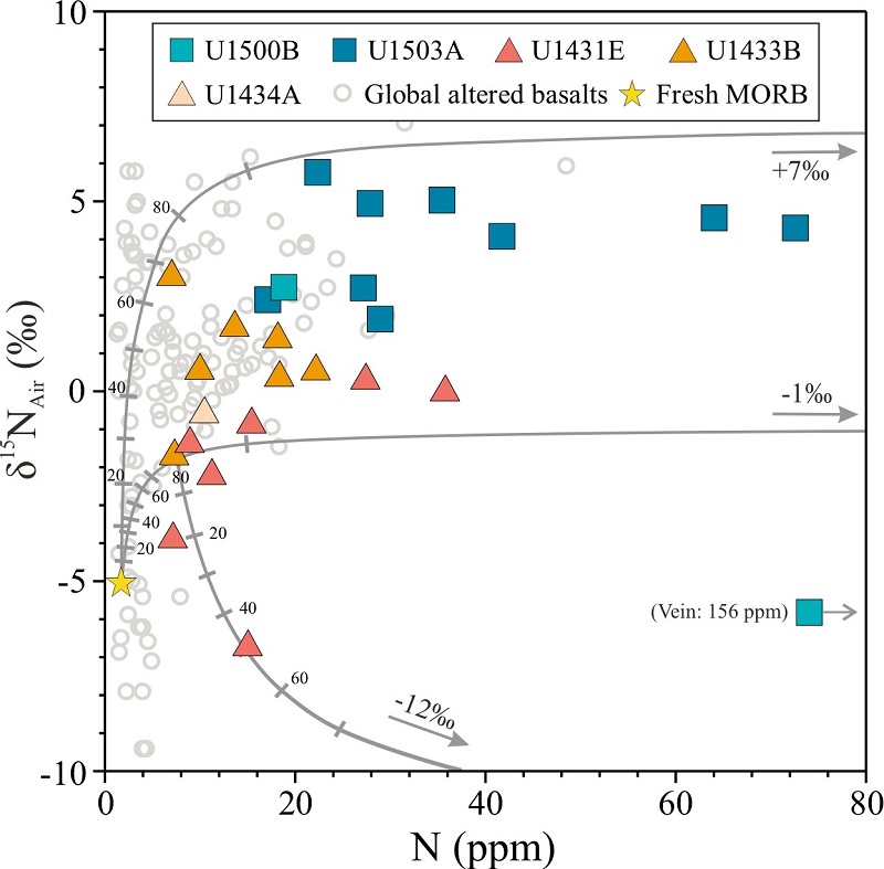 研究团队基于国际大洋发现计划(IODP)在南海钻获的玄武岩样品,系统开展了氮含量与同位素组成分析。研究发现,南海玄武岩氮含量显著高于全球大洋平均值。通过二元混合模拟,研究揭示南海玄武岩中的氮主要来源于上覆富粘土沉积物,并有少量非生物氮还原的贡献。进一步分析表明,除了周围环境次生氮可用性外,洋壳蚀变程度也是控制氮富集的关键因素。在次生氮可用性高的条件下,洋壳蚀变程度越高,氮富集越显著。基于这一新认识,研究团队重新估算出全球俯冲带上部洋壳的氮输入通量为6.8 ± 0.7 × 109 mol⋅yr-1,这几乎是之前估计值的两倍。