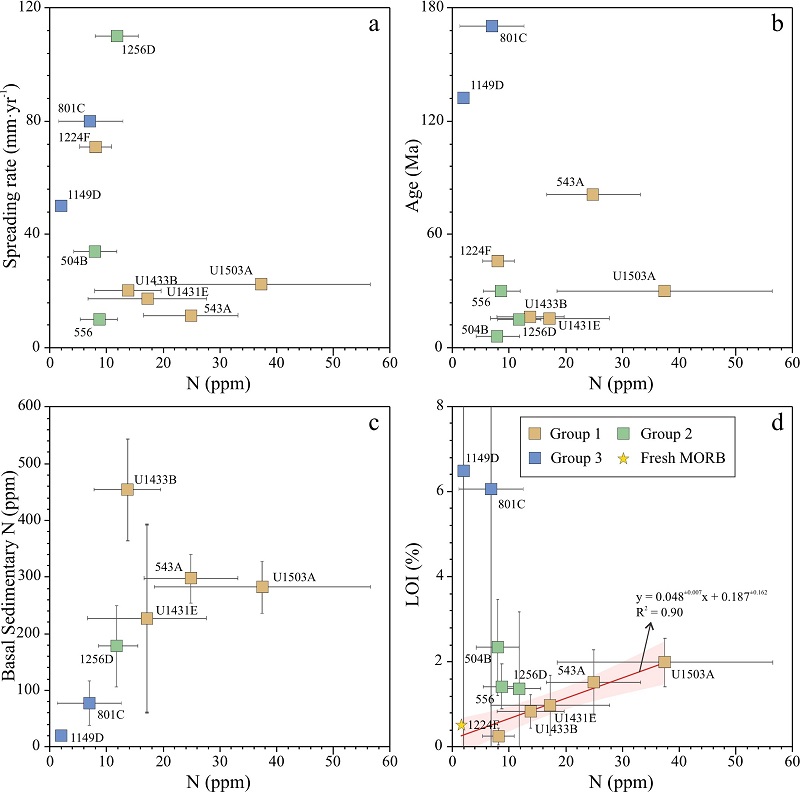 图3 蚀变玄武岩平均N含量与(a)扩张速率、(b)洋壳年龄、(c)基底沉积物N含量和(d)平均LOI含量关系图