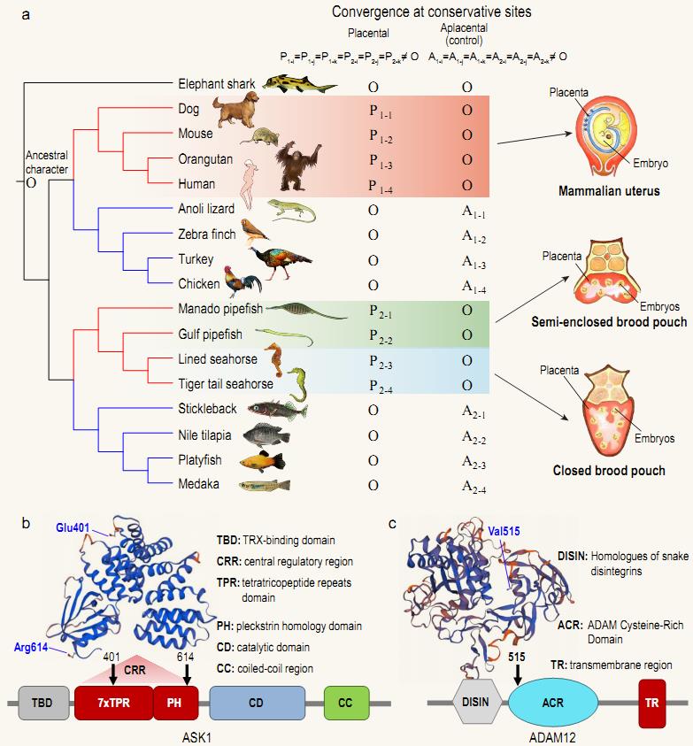 研究团队通过多种海洋鱼类全基因组比较与解析,揭示了海龙科鱼类进化速率的特征(图1);随后,在对不同海龙科物种复杂性状形成机制的分析过程中,发现了SCPPs、tbx4等功能基因在物种性状进化过程中的关键功能,揭示了Pcdh基因家族在海龙科物种中显著扩张,阐明non-clustered Pcdhs基因对于海龙科物种胎盘发育和胚胎着床的功能特征;该研究原创性地将海龙科物种的胎盘与高等哺乳动物的胎盘进行趋同进化研究,从全基因组层面进行深入挖掘,发现了海龙科鱼类118个基因与胎盘类哺乳动物趋同进化,且这些基因参与了育儿袋内细胞增殖与凋亡、血管增生及胚胎发育等生命过程(图2)。