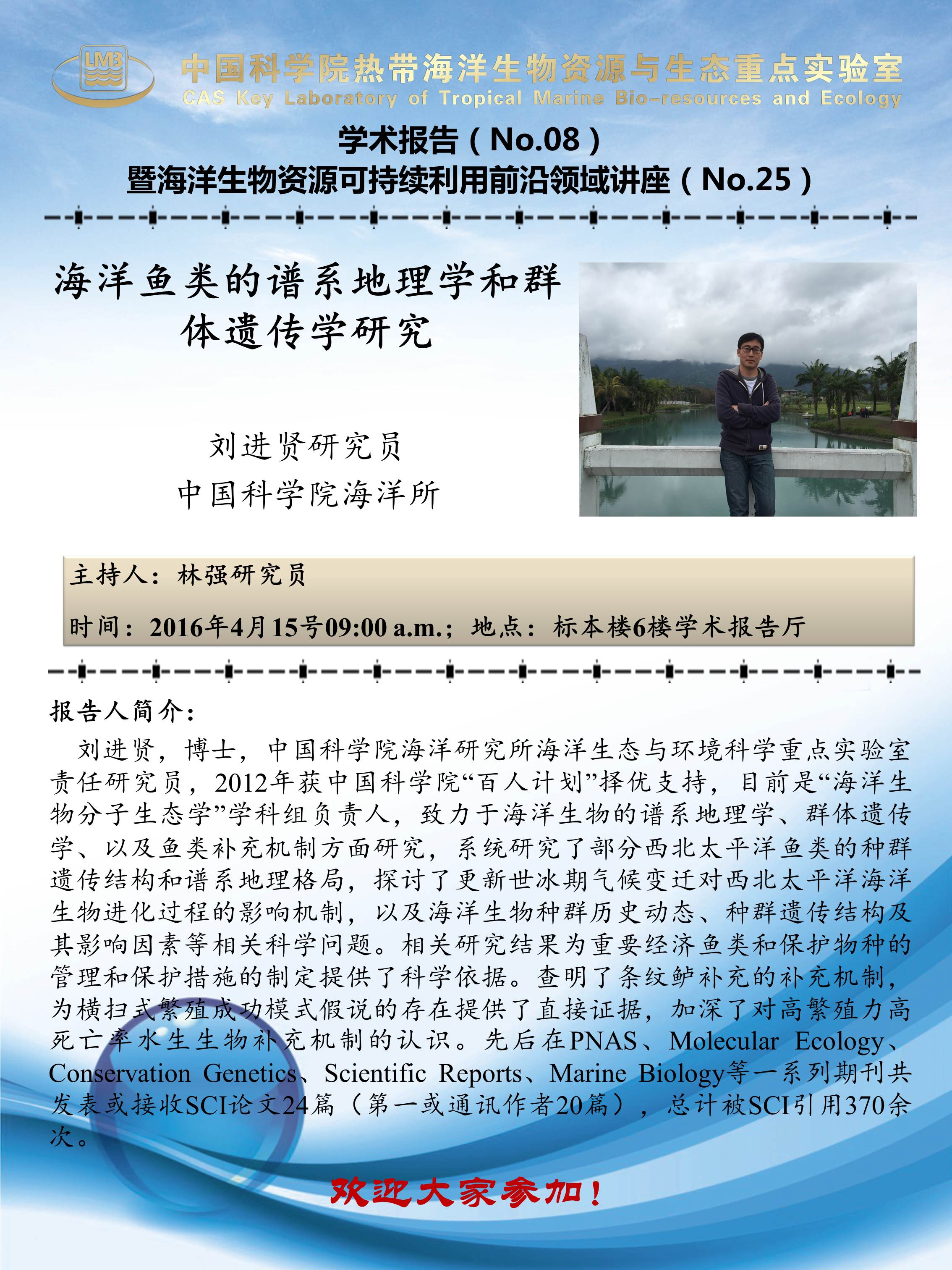 【4月15日LMB学术报告】海洋鱼类的谱系地理学和群体遗传学研究
