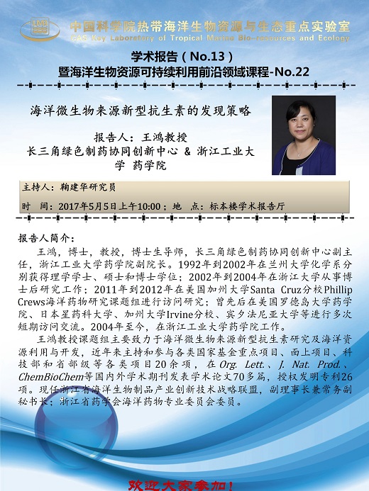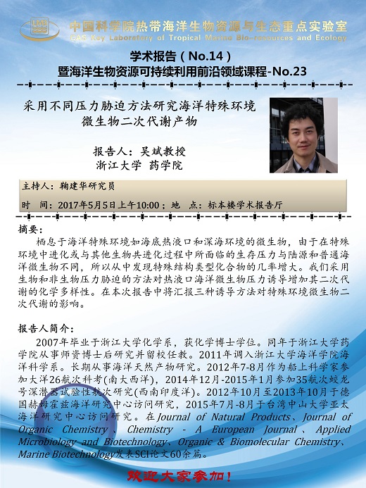 【5月5日LMB学术报告暨海洋生物资源可持续利用前沿领域课程】采用不同压力胁迫方法研究海洋特殊环境微生物二次代谢产物;采用不同压力胁迫方法研究海洋特殊环境微生物二次代谢产物