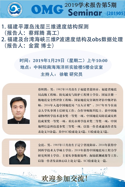 【1月29日OMG学术报告】福建平潭岛浅层三维速度结构探测等