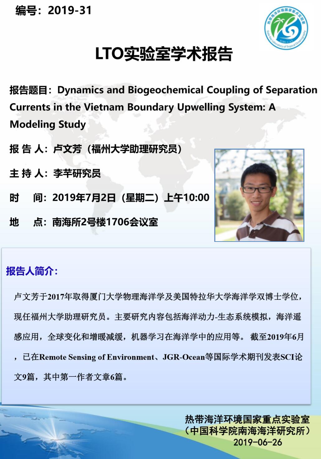 【7月2日LTO学术报告】Dynamics and Biogeochemical Coupling of Separation Currents in the Vietnam Boundary Upwelling System: A Modeling Study
