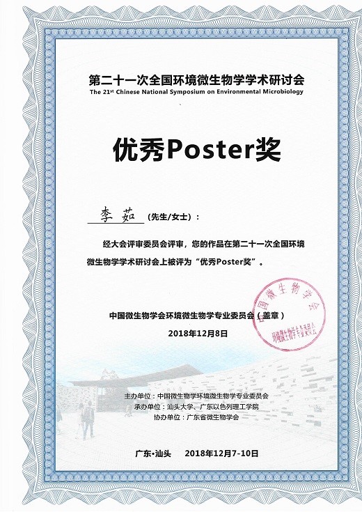 李茹同学荣获“第二十一次全国环境微生物学学术研讨会”优秀墙报奖