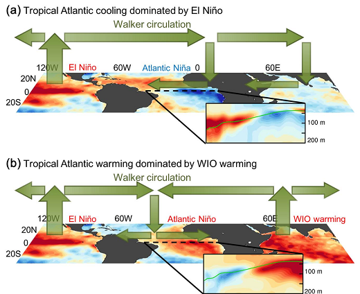 图1 基于三大洋相互作用的印度洋气候效应示意图。(a) 太平洋厄尔尼诺产生异常Walker环流,迫使热带大西洋上空的产生东风异常,增强了温跃层的倾斜程度,引发大西洋尼娜。(b) WIO海域暖异常产生的Walker环流异常与厄尔尼诺竞争。使热带大西洋上空的西风异常减弱,并减弱了温跃层的倾斜程度,引发大西洋尼诺。WIO海域海温异常决定了厄尔尼诺事件下一年夏季热带大西洋出现的是大西洋尼诺还是大西洋尼娜事件。正(负)海温异常用红色(蓝色)表示。
