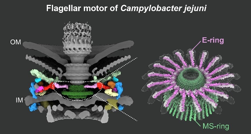 细菌鞭毛是一种高度精密的纳米机器,能够驱动细胞在复杂环境中运动。尽管冷冻电子断层扫描(cryo-ET)技术揭示了鞭毛马达显著的结构多样性,但周质空间中多种辅助支架结构仍缺乏系统研究。其中,E环虽早在1979年就被观测到,但其分子组成与功能长期不明。本团队近期研究证实(Feng et. al, Nat Microbiol., 2026 Mar ;11(3):770-785.)E环由FlgY及其同源蛋白构成,呈现保守的“环-辐条”结构,环绕在MS环上方(图1)。