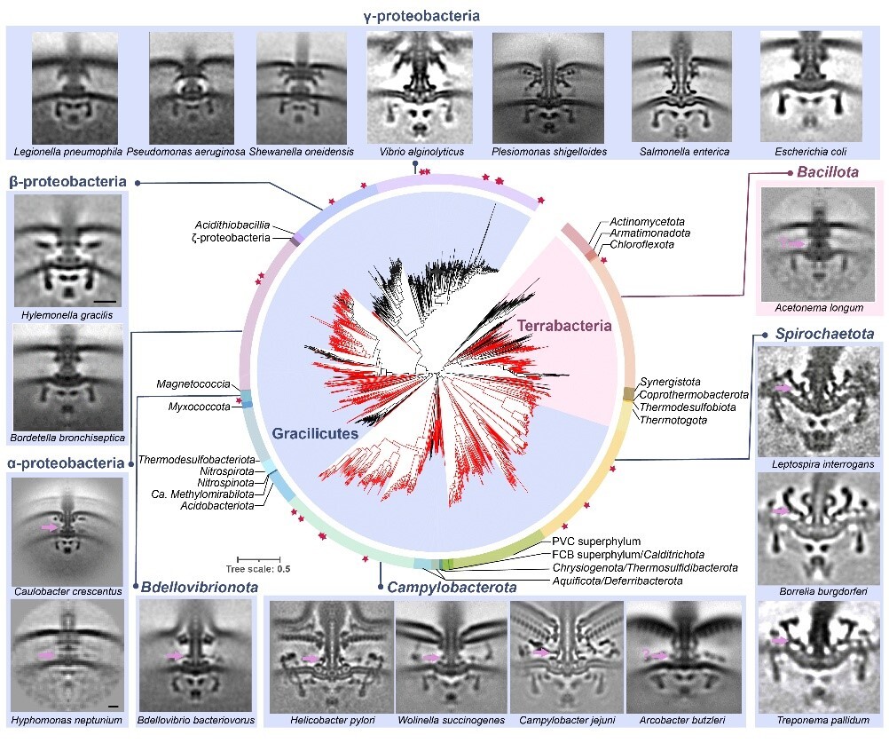 进化分析显示,约三分之二具有鞭毛的细菌编码FlgY同源蛋白。该蛋白广泛分布于多个细菌门类,但在β-和γ-变形菌中普遍缺失(图2)。这一分布模式表明,E环可能起源于细菌的共同祖先,而部分谱系在进化过程中发生了基因丢失,从而挑战了以大肠杆菌为代表的简单鞭毛结构作为原始形态的传统观点。综上所述,E环是细菌鞭毛马达中一种古老的结构模块,其为理解细菌运动系统的起源和演化提供了重要线索。