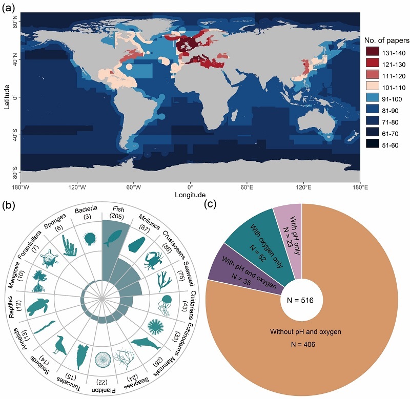 随着气候变化对全球海洋的深远影响,海洋物种的分布正经历着前所未有的变化。气候变化通过海洋变暖、酸化、缺氧等多重途径,重塑全球海洋生物的地理分布格局,并在生态系统功能、渔业经济可持续性以及海洋空间治理等层面引发深远的连锁效应。对过去45年间发表的516篇海洋物种分布模型的文献进行梳理后发现,95.7%的研究使用了温度作为预测因子,仅6.8%的研究同时将pH和溶解氧纳入物种分布模型(图1)。海洋变暖已经成为广泛研究的焦点,温度作为最常用的预测因子,几乎主导了海洋物种分布模型(SDMs)的应用。然而,海洋酸化和缺氧这两个重要的环境胁迫因素,尽管它们在生物学上具有深远影响,但物种分布模型评估气候驱动下海洋生物分布范围变化的研究极大地忽视了这些因素。