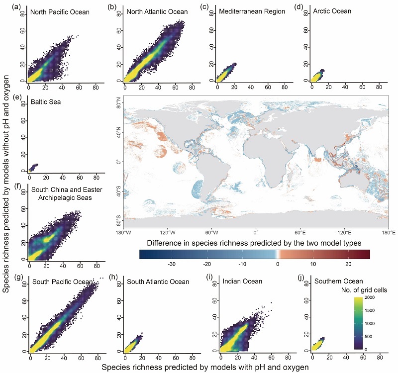 研究发现,两类SDMs预测的适宜分布区范围大小存在差异,表明酸化和缺氧对冷水珊瑚分布具有约束效应。两类物种分布模型在全球尺度上物种丰富度预测结果显示高度相关,但在约三分之一地区的空间分布格局存在明显差异(图2)。