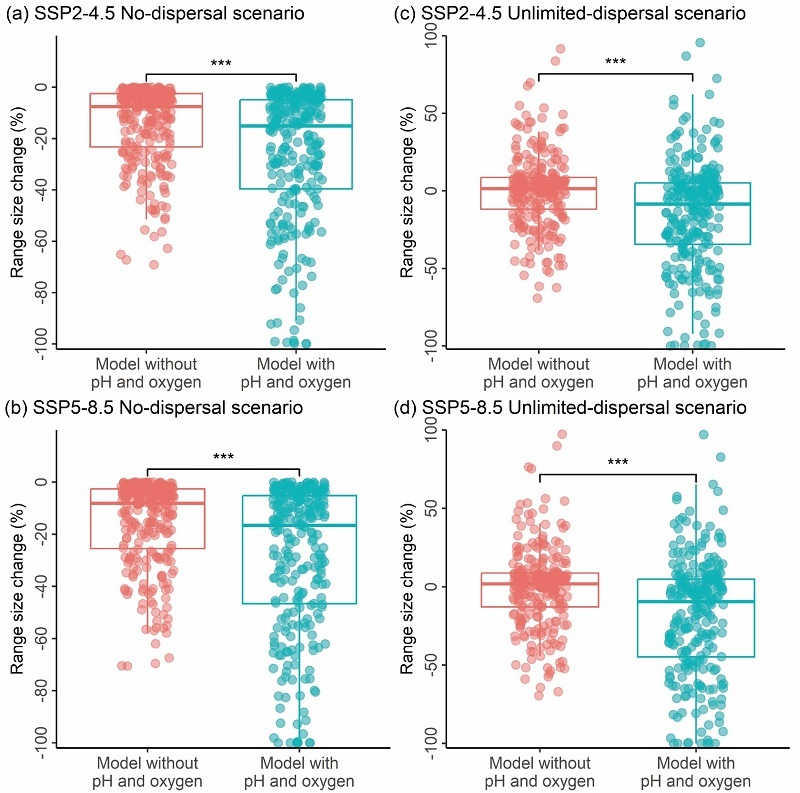 在中等社会经济发展路径(SSP2-4.5)与高碳排放、高经济增长路径(SSP5-8.5)下,分别基于物种无扩散能力和无限扩散能力假设,同时纳入pH与溶解氧因子的物种分布模型均一致预测:冷水珊瑚的分布范围将出现更大幅度的缩减(图3)。总体而言纳入pH和溶解氧的物种分布模型预测的气候变化导致的分布范围损失比未考虑这两个因子的模型平均高出16.8%。