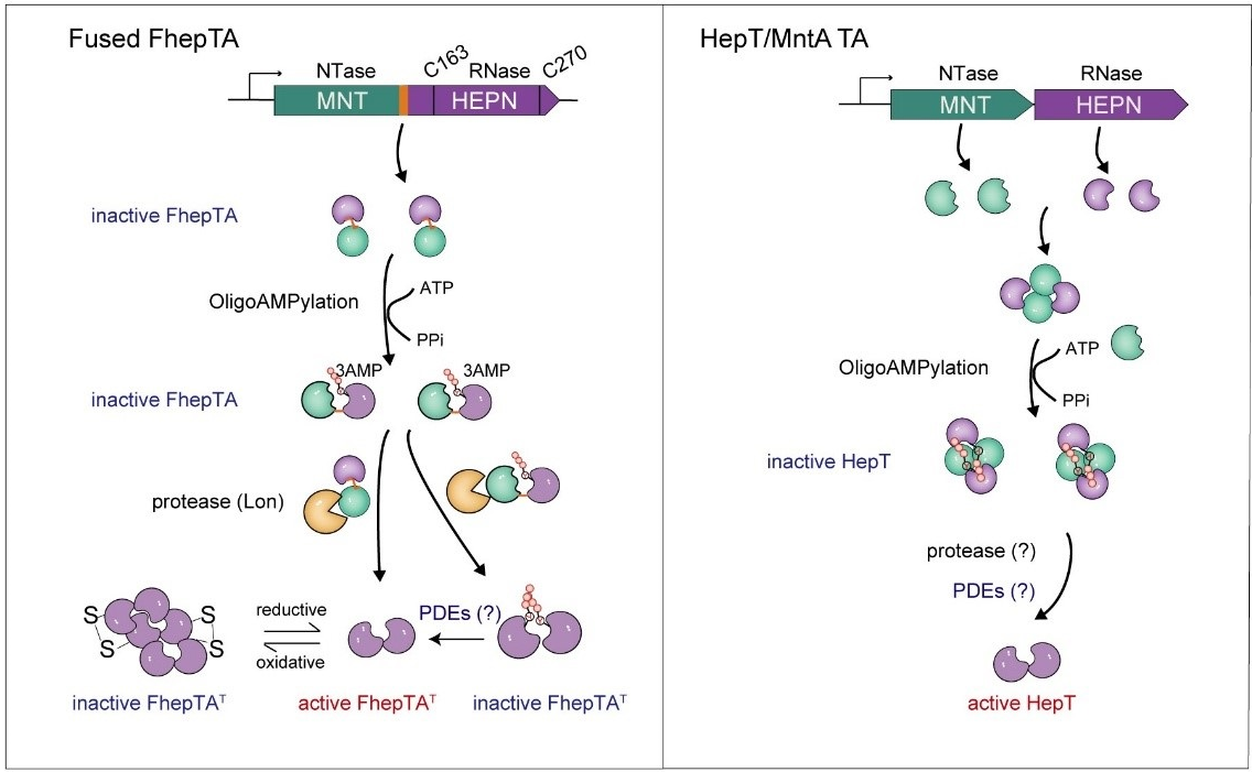 毒素-抗毒素(toxin-antitoxin, TA)系统广泛存在于细菌等原核生物中,在微生物适应不同环境条件中发挥重要功能。七型TA系统是由王晓雪团队首次在国际上报道的一类新型TA类型(Yao et al., 2020, Nucleic Acids Research),其核心特征是抗毒素通过酶促反应对毒素进行翻译后修饰。然而,除经典的双顺反子结构外,原核生物基因组中还普遍存在一类特殊的融合型TA系统-MNT抗毒素结构域与HEPN毒素结构域融合在同一条多肽链中。但融合型TA系统的调控机制始终是领域内的未解之谜:融合型系统中MNT与HEPN以1:1的比例存在,它如何实现毒素的精准沉默?又如何在环境压力条件下快速释放毒素活性?