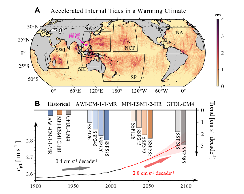 成果简介:面向全球变暖背景下海洋动力过程变化的战略需求,聚焦全球海洋内潮能量传递这一关键科学问题,揭示了内潮在气候变暖背景下呈现显著加速的新趋势,并阐明了上层海洋层结增强与环流加速在其中发挥的关键作用。
