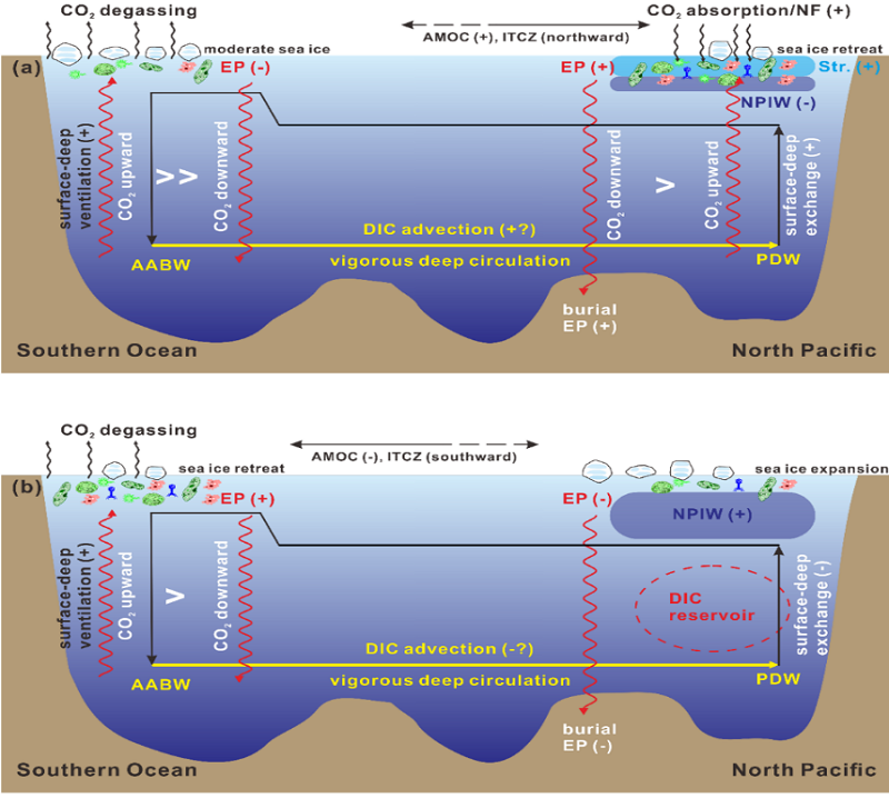 末次冰消期(a:B/A暖期;b:冷事件)南大洋和北太平洋海区物理-生物地化过程及其对海气碳循环的潜在意义