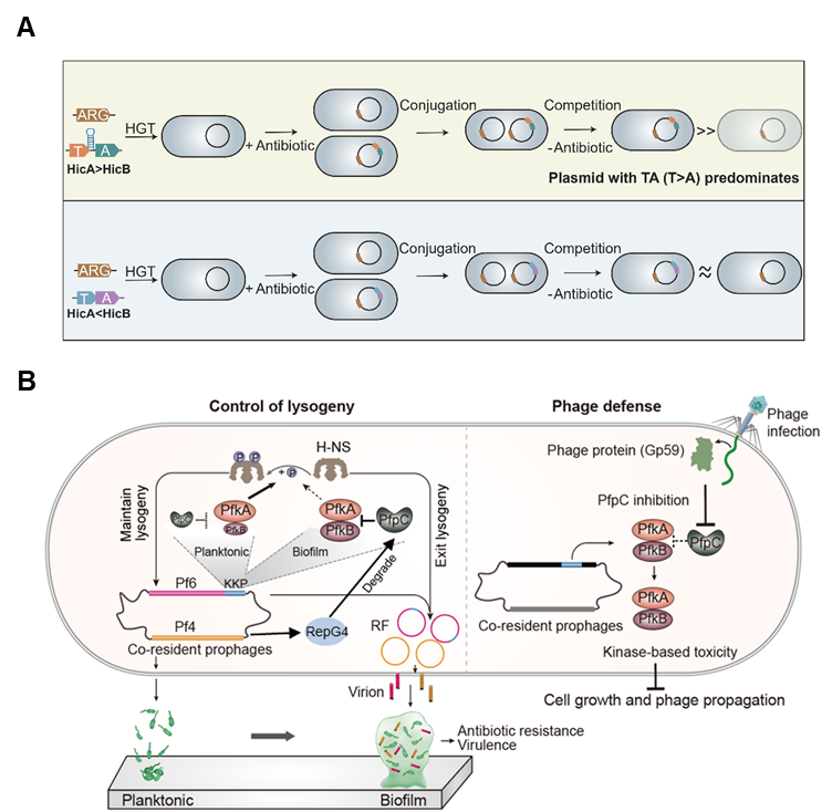 成果简介:海洋微生物通过水平基因转移(如噬菌体与质粒介导)持续重塑其环境适应策略,深刻影响群落结构与功能。本研究聚焦于质粒与噬菌体编码的毒素-抗毒素(TA)系统,系统揭示其在基因传播、宿主‑病毒稳态及环境响应中的核心作用,取得以下创新成果:在机制层面,阐明接合型质粒通过非经典内在终止子重编程HicAB TA系统转录,强化“成瘾效应”,显著提升其在细菌群体中的传播竞争力,揭示了质粒在海洋微生物中动态维持的分子基础。在噬菌体‑宿主互作层面,首次解析多重溶原噬菌体通过“核心基因‑附属基因”对话机制:利用复制蛋白降解抗毒素、激活毒素,协调有序复制与释放,维持宿主‑病毒稳态,增强细菌生物膜适应性与致病力。同时,发现噬菌体编码的膜蛋白多肽可特异性增加宿主膜渗透性,展现其作为特异性调控因子的潜力。在环境响应层面,揭示氧化应激通过宿主OxyR蛋白直接激活前噬菌体切除的分子通路,阐明环境胁迫与基因元件活化的关键联结。上述成果从内在调控机制、宿主‑病毒互作到环境信号整合,系统阐释TA网络在海洋微生物基因转移、环境适应与群落互作中的多重功能,为认知海洋微生物生态提供了新理论框架。