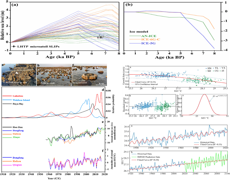 在“古环境”维度,团队不仅是还原过去,更旨在为现代生态风险评估寻找历史坐标。通过高分辨率重建中全新世的海温季节性特征、海平面稳态机制 及超级古台风序列 ,团队揭示了自然背景下的气候变率;特别是对全新世珊瑚“生长停滞期”的解析 ,为预判现代珊瑚礁在未来持续升温与极端气候下的生态韧性阈值提供了关键的地质实证。