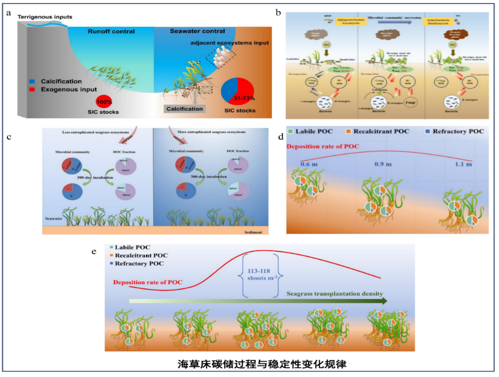 成果简介:海草床是重要蓝碳生态系统,其碳储能力对全球碳循环与气候调节具有关键作用。然而,其碳汇功能受到沉积物无机碳抵消效应、富营养化胁迫以及修复策略效率不明等多重过程的影响,相关机制尚不清晰,严重制约了对其蓝碳功能的评估与管理。针对上述科学问题,本研究系统阐明了南海海草床碳储能力的关键变化机制,并取得了系列创新性认识:(1)在碳汇抵消机制方面,通过同位素示踪技术,首次明确南海海草床沉积物无机碳主要来源于陆源或珊瑚礁跨系统输入(70%-100%),原位生成贡献低,厘清了无机碳生成对有机碳埋藏的抵消风险极为有限。(2)在碳稳定性响应机制方面,从微生物角度揭示了富营养化削弱碳存储的途径:营养盐输入通过促进特定微生物增殖,加速惰性溶解有机碳的分解;同时改变凋落物分解的微生物群落,减少惰性组分存储。(3)在碳汇提升途径方面,通过野外实验首次明确海草移植存在“密度-水深”阈值效应,在约0.9米水深、113-118株/m2的密度下,有机碳沉积效率最高,为修复工程提供了优化方案。