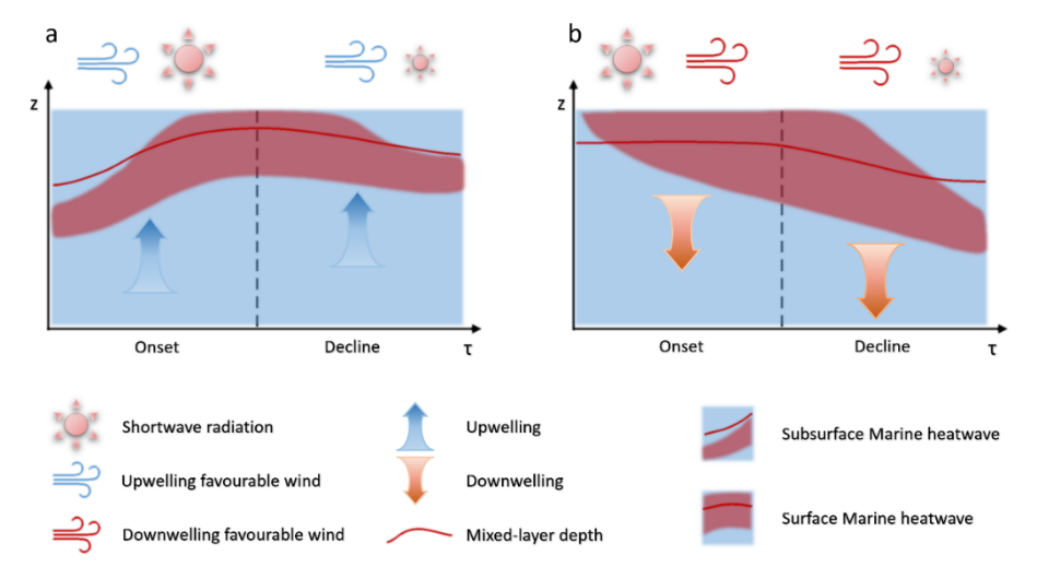 季节性大气强迫、上升流系统与海洋热浪相互作用示意图