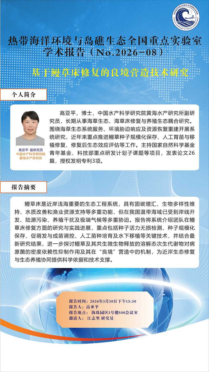 【3月30日热带海洋环境与岛礁生态全国重点实验室学术报告】基于鳗草床修复的良境营造技术研究