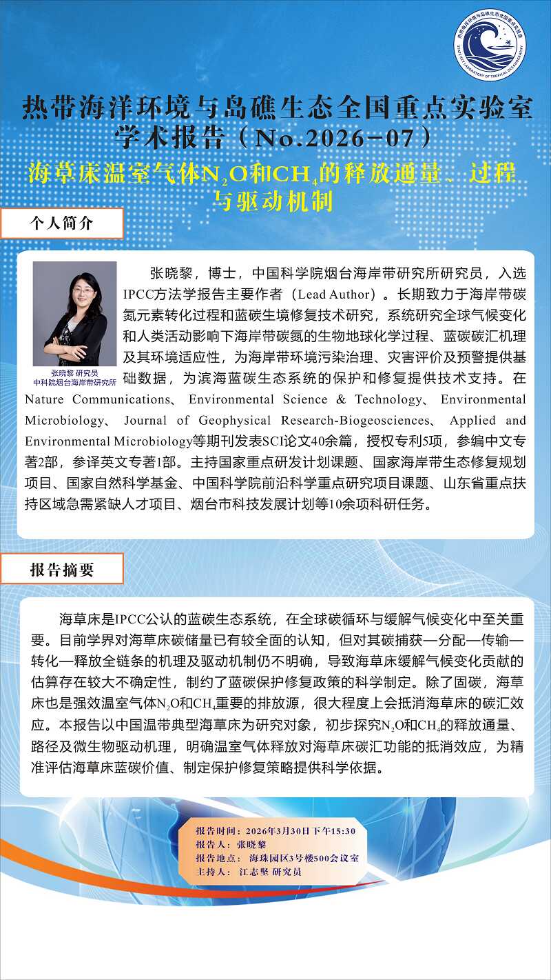 【3月30日热带海洋环境与岛礁生态全国重点实验室学术报告】海草床温室气体N2O和CH4的释放通量过程与驱动机制