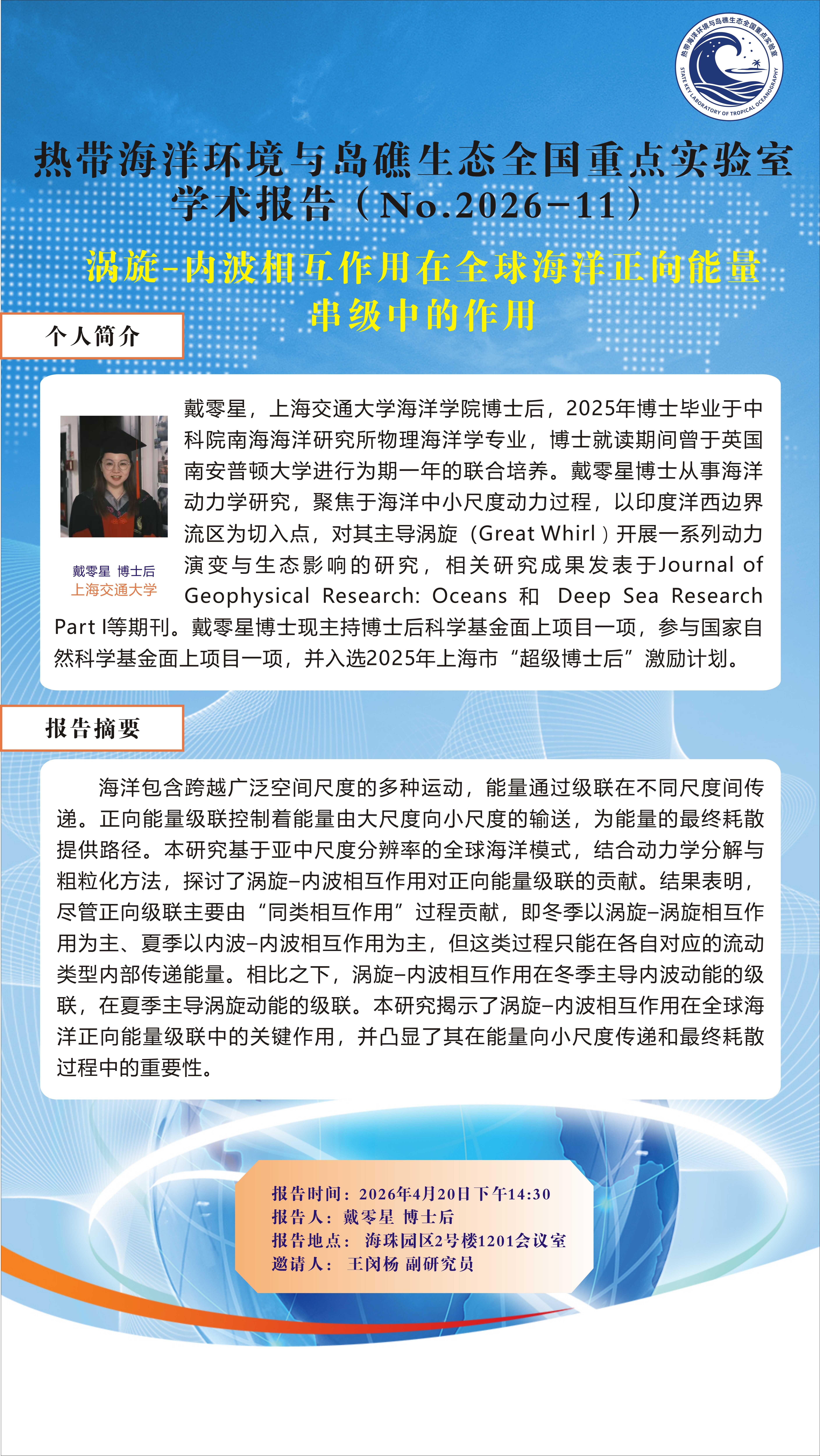 【4月20日热带海洋环境与岛礁生态全国重点实验室学术报告】涡旋-内波相互作用再全球海洋正向能量串级中的作用