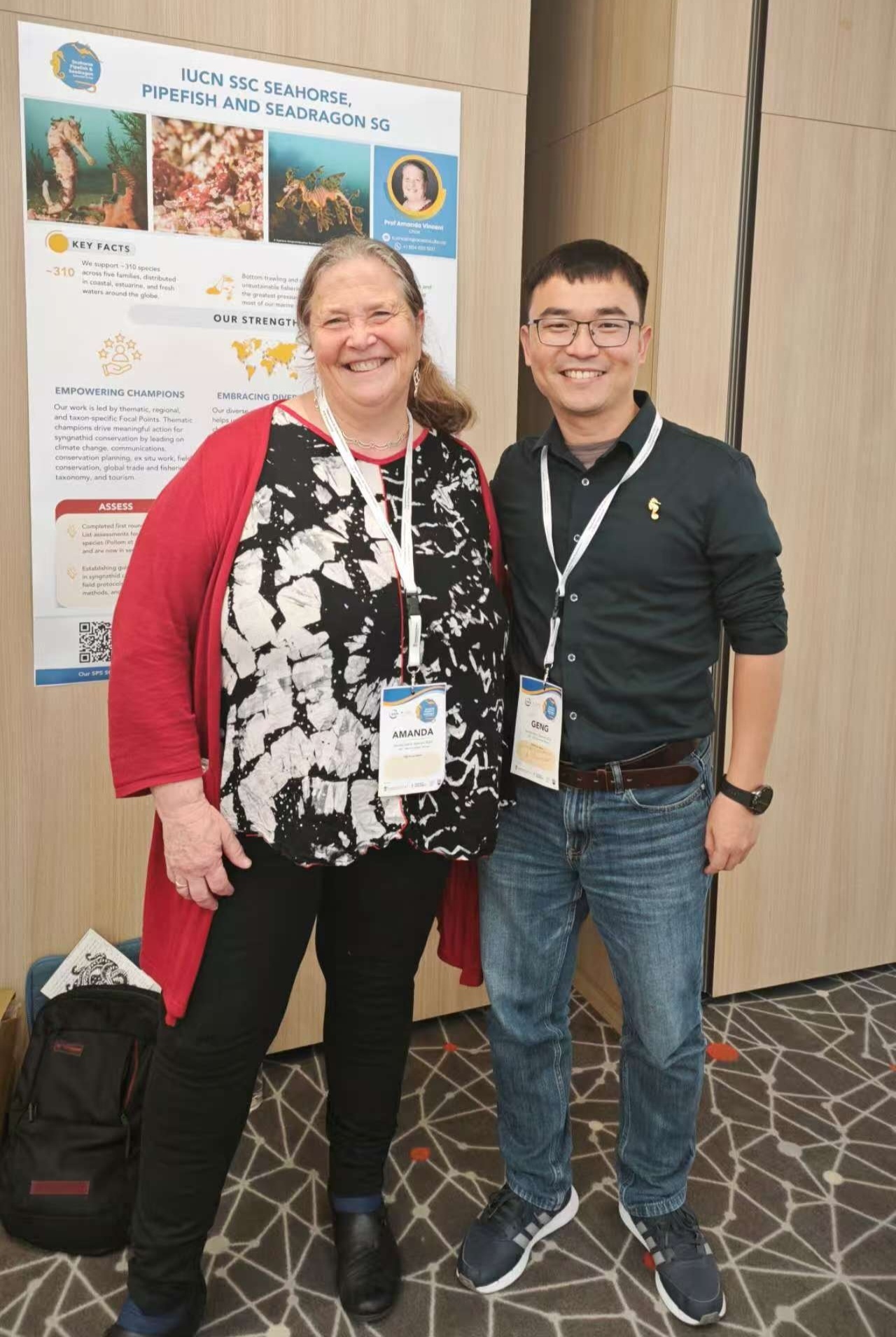 2024年11月,秦耿参加世界自然保护联盟IUCN物种存续委员会海龙科鱼类专题研讨会与Amanda Vincent院士合影