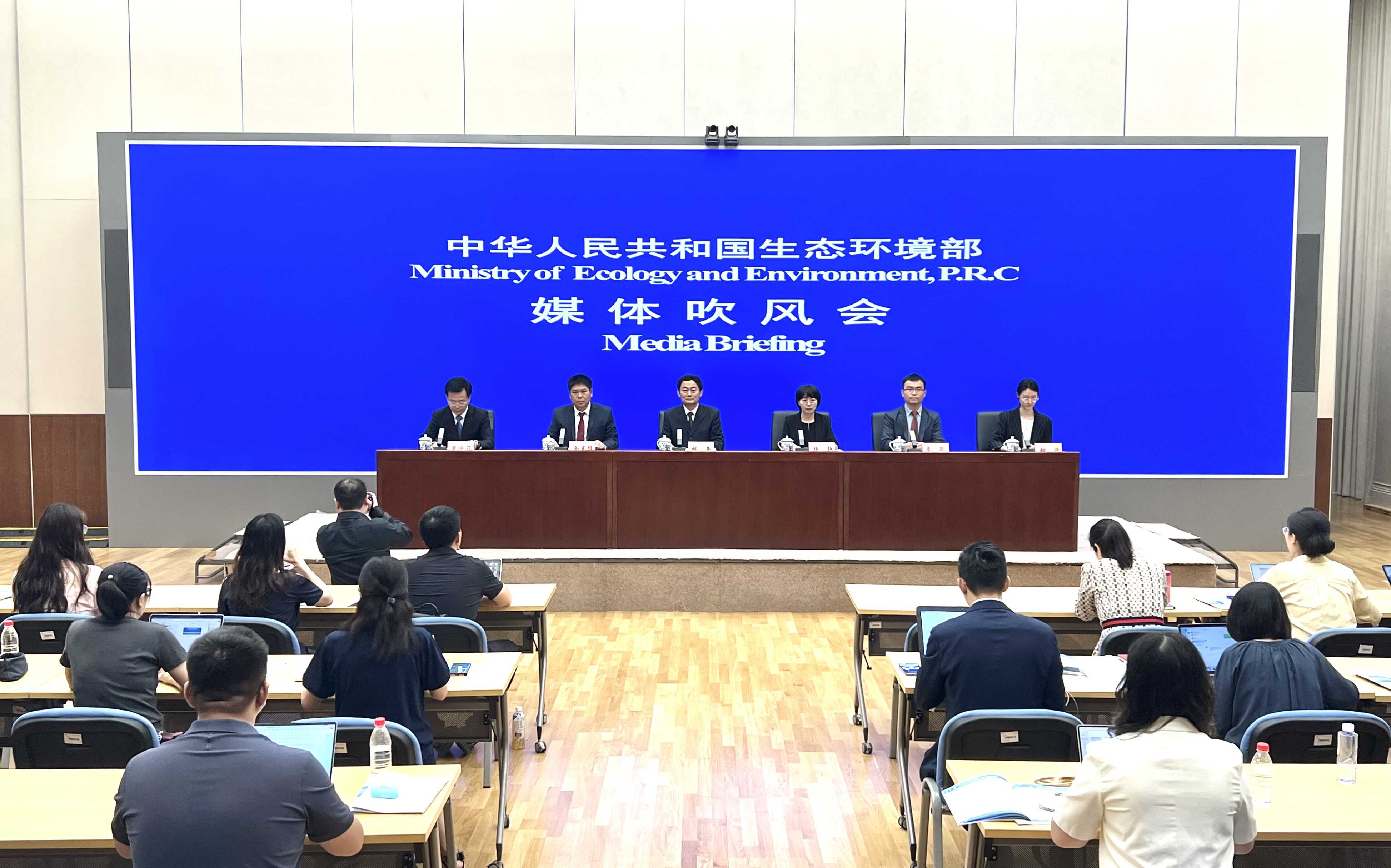 2024年7月10日,秦耿(主席台右2)作为南海海洋所科学家代表出席生态环境部黄岩岛生态环境报告媒体吹风会